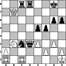 game notation in PGN-format [Event "Der HSF feiert Geburtstag-feiert gerne dabei mit!"] [Site "www.myChess.de"] [Date "2012.05.01"] [Round "1"] [White "haggard"] [Black "pepo47"] [ECO "A13"] [WhitemyELO "1990"] [BlackmyELO "2003"] [Result "1/2-1/2"] [TimeControl "10/2592000"] [WhiteDays "30"] [BlackDays "30"] [MyChessNo "81535"] 1. c4 e6 2. g3 d5 3. Bg2 dxc4 4. Qa4+ Nd7 5. Qxc4 c5 6. Nf3 Ngf6 7. O-O b6 8. Ng5 Rb8 9. d3 Ne5 10. Qb3 h6 11. Ne4 Nxe4 12. Bxe4 Bd6 13. Bf4 O-O 14. Nd2 Ng4 15. Bxd6 Qxd6 16. Qa3 Qe7 17. d4 Rd8 18. Nb3 Nf6 19. Bg2 Bb7 20. Bxb7 Qxb7 21. dxc5 bxc5 22. Qxc5 Rbc8 23. Qe3 a5 24. Nxa5 Qxb2 25. Qf3 Nd5 26. e3 g6 27. Kg2 f5 28. Nb3 e5 29. Rfb1 Qc2 30. Kh1 Nc3 31. Rc1 Qd3 32. Qb7 1/2-1/2 position notation in FEN-format 2rr2k1/1Q6/6pp/4pp2/8/1NnqP1P1/P4P1P/R1R4K - - - 7 32 Captured white pieces: Captured black pieces: Click on a captured piece in order to display the desired move!