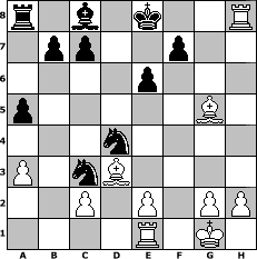 game notation in PGN-format [Event "Bauer sucht Dame"] [Site "www.myChess.de"] [Date "2017.12.02"] [Round "1"] [White "Grubengeist"] [Black "sprinterde"] [ECO "C15"] [WhitemyELO "2053"] [BlackmyELO "1706"] [Result "1-0"] [TimeControl "10/2592000"] [WhiteDays "89"] [BlackDays "87"] [MyChessNo "110562"] 1. e4 e6 2. d4 d5 3. Nc3 Bb4 4. a3 Bxc3 5. bxc3 dxe4 6. f3 Nf6 7. fxe4 Nxe4 8. Qg4 Nf6 9. Qxg7 Rg8 10. Qh6 Rg6 11. Qe3 Nd5 12. Qf2 Nxc3 13. Bd3 Rf6 14. Nf3 Nc6 15. O-O h6 16. Qh4 Qe7 17. Bxh6 Rxf3 18. Qxe7+ Kxe7 19. Rxf3 Nxd4 20. Bg5+ Ke8 21. Rh3 Kd7 22. Re1 a5 23. Rh7 Ke8 24. Rh8+ 1-0 position notation in FEN-format r1b1k2R/1pp2p2/4p3/p5B1/3n4/P1nB4/2P1P1PP/4R1K1 - - - 3 24 Captured white pieces: Captured black pieces: Click on a captured piece in order to display the desired move!
