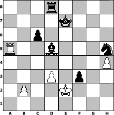 game notation in PGN-format [Event "Loyal to the Game II"] [Site "www.myChess.de"] [Date "2006.01.30"] [Round "1"] [White "FreshPrinc2"] [Black "Biber"] [ECO "C21"] [WhitemyELO "889"] [BlackmyELO "1330"] [Result "0-1"] [TimeControl "10/864000"] [WhiteDays "10"] [BlackDays "10"] [MyChessNo "22018"] 1. e4 e5 2. d4 d5 3. dxe5 Nc6 4. exd5 Nxe5 5. Bb5+ c6 6. dxc6 Qxd1+ 7. Kxd1 bxc6 8. Bc4 Nxc4 9. Nd2 Nxd2 10. Bxd2 f5 11. Nf3 Nf6 12. Re1+ Be7 13. Ng5 h6 14. Ne6 Kd7 15. Ba5 Rb8 16. Bc7 Rb7 17. Re5 Bd6 18. Bxd6 Kxd6 19. Re3 Bxe6 20. Ke1 Ke7 21. Rd1 Rd7 22. Red3 Rhd8 23. f4 g5 24. fxg5 hxg5 25. g3 Rxd3 26. cxd3 Bxa2 27. h4 gxh4 28. gxh4 f4 29. Ke2 a5 30. Rf1 Nh5 31. Ra1 Bd5 32. Rxa5 f3+ 0-1 position notation in FEN-format 3r4/4k3/2p5/R2b3n/7P/3P1p2/1P2K3/8 - - - 0 33 Captured white pieces: Captured black pieces: Click on a captured piece in order to display the desired move!