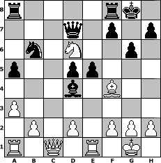 game notation in PGN-format [Event "Wer schnell zieht,ist schneller fertig!"] [Site "www.myChess.de"] [Date "2015.10.08"] [Round "1"] [White "reisinger"] [Black "Joschi"] [ECO "A56"] [WhitemyELO "1448"] [BlackmyELO "1620"] [Result "0-1"] [TimeControl "10/1728000"] [WhiteDays "20"] [BlackDays "20"] [MyChessNo "100729"] 1. d4 Nf6 2. c4 c5 3. Nf3 g6 4. Bf4 Bg7 5. e3 O-O 6. Nc3 cxd4 7. exd4 d5 8. c5 a5 9. Na4 Nc6 10. Bb5 Bd7 11. O-O Nb4 12. Bxd7 Nxd7 13. a3 Nc6 14. Re1 b6 15. cxb6 Nxb6 16. Nc5 e6 17. Qc1 Nxd4 18. Nxd4 Bxd4 19. Nb7 Qd7 20. Nd6 e5 0-1 position notation in FEN-format r4rk1/3q1p1p/1n1N2p1/p2pp3/3b1B2/P7/1P1P1PPP/R1Q1R1K1 - - - 0 21 Captured white pieces: Captured black pieces: Click on a captured piece in order to display the desired move!