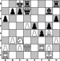 game notation in PGN-format [Event "Froms Gambit abgelehnt"] [Site "www.myChess.de"] [Date "2005.11.15"] [Round "2"] [White "UPS"] [Black "reisinger"] [ECO "A02"] [WhitemyELO "1746"] [BlackmyELO "1659"] [Result "1-0"] [TimeControl "10/2592000"] [WhiteDays "30"] [BlackDays "30"] [MyChessNo "19655"] 1. f4 e5 2. d3 Nc6 3. Nf3 exf4 4. Bxf4 d6 5. e3 Bg4 6. Be2 Nf6 7. O-O Qd7 8. Nc3 h6 9. Qd2 O-O-O 10. d4 a6 11. d5 Bxf3 12. Bxf3 Ne5 13. Be2 Ng6 14. h3 Ne5 15. b3 g5 16. Bxe5 dxe5 17. Rxf6 Bg7 18. Rf2 f5 19. e4 f4 20. Bg4 1-0 position notation in FEN-format 2kr3r/1ppq2b1/p6p/3Pp1p1/4PpB1/1PN4P/P1PQ1RP1/R5K1 - - - 1 20 Captured white pieces: Captured black pieces: Click on a captured piece in order to display the desired move!