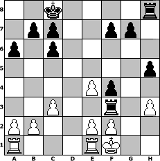 game notation in PGN-format [Event "Schachkreis #2"] [Site "www.myChess.de"] [Date "2018.07.05"] [Round "1"] [White "Steffi"] [Black "JohnWayne"] [ECO "C68"] [WhitemyELO "1568"] [BlackmyELO "1705"] [Result "0-1"] [TimeControl "10/2592000"] [WhiteDays "29"] [BlackDays "27"] [MyChessNo "112510"] 1. e4 e5 2. Nf3 Nc6 3. Bb5 a6 4. Bxc6 dxc6 5. O-O Qf6 6. d3 Bg4 7. Nbd2 Bd6 8. h3 h5 9. Re1 Ne7 10. c3 O-O-O 11. Nc4 Bxf3 12. Nxd6+ Rxd6 13. Qxf3 Qxf3 14. gxf3 Rxd3 15. Kg2 Ng6 16. Be3 Nf4+ 17. Bxf4 exf4 18. Kf1 Rxf3 0-1 position notation in FEN-format 2k4r/1pp2pp1/p1p5/7p/4Pp2/2P2r1P/PP2PP2/R3RK2 - - - 0 19 Captured white pieces: ![]() ![]() ![]() ![]() ![]() ![]() ![]() ![]() ![]() ![]() ![]() ![]() ![]() ![]() ![]() Captured black pieces: ![]() ![]() ![]() ![]() ![]() ![]() ![]() ![]() ![]() ![]() ![]() ![]() ![]() ![]() ![]() Click on a captured piece in order to display the desired move!