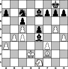 game notation in PGN-format [Event "2.HSF-Clubmeisterschaften 2011/12 Gruppe B"] [Site "www.myChess.de"] [Date "2011.09.01"] [Round "1"] [White "schoemi"] [Black "leitsgeheier"] [ECO "D00"] [WhitemyELO "1576"] [BlackmyELO "1625"] [Result "1/2-1/2"] [TimeControl "10/2592000"] [WhiteDays "21"] [BlackDays "19"] [MyChessNo "76010"] 1. d4 d5 2. e4 dxe4 3. Nc3 Nf6 4. f3 Bf5 5. g4 Bg6 6. g5 Nd5 7. Nxe4 Nc6 8. Bb5 e6 9. Bxc6+ bxc6 10. Ne2 c5 11. dxc5 Nb4 12. Be3 Qxd1+ 13. Kxd1 Rd8+ 14. Kc1 Be7 15. h4 Nd5 16. Bf2 c6 17. a3 O-O 18. b4 Rd7 19. c4 Nc7 20. Nf4 Bf5 21. Rd1 Rfd8 22. Rxd7 Rxd7 23. Ra2 e5 24. Ng2 Rd3 25. Ne1 Rd8 26. Rd2 Rxd2 27. Kxd2 Bxe4 1/2-1/2 position notation in FEN-format 6k1/p1n1bppp/2p5/2P1p1P1/1PP1b2P/P4P2/3K1B2/4N3 - - - 0 28 Captured white pieces: ![]() ![]() ![]() ![]() ![]() ![]() ![]() ![]() ![]() ![]() ![]() ![]() ![]() ![]() ![]() Captured black pieces: ![]() ![]() ![]() ![]() ![]() ![]() ![]() ![]() ![]() ![]() ![]() ![]() ![]() ![]() ![]() Click on a captured piece in order to display the desired move!