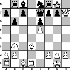 game notation in PGN-format [Event "2. Norderstedter DENK MAL Open 2011"] [Site "www.myChess.de"] [Date "2011.06.02"] [Round "1"] [White "Master1"] [Black "Knight"] [ECO "A45"] [WhitemyELO "1322"] [BlackmyELO "1122"] [Result "1-0"] [TimeControl "10/2592000"] [WhiteDays "30"] [BlackDays "30"] [MyChessNo "74306"] 1. d4 Nf6 2. e3 d6 3. Bd3 e6 4. Nf3 d5 5. Nbd2 Nc6 6. O-O Bd6 7. e4 O-O 8. e5 Bxe5 9. dxe5 Ne8 10. c3 b6 11. Qe2 d4 12. cxd4 Nxd4 13. Nxd4 Qxd4 14. Nb3 Qd8 15. Rd1 Qe7 16. Qe4 Rb8 17. Qxh7# 1-0 position notation in FEN-format 1rb1nrk1/p1p1qppQ/1p2p3/4P3/8/1N1B4/PP3PPP/R1BR2K1 - - - 0 17 Captured white pieces: ![]() ![]() ![]() ![]() ![]() ![]() ![]() ![]() ![]() ![]() ![]() ![]() ![]() ![]() ![]() Captured black pieces: ![]() ![]() ![]() ![]() ![]() ![]() ![]() ![]() ![]() ![]() ![]() ![]() ![]() ![]() ![]() Click on a captured piece in order to display the desired move!