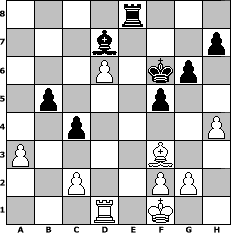 game notation in PGN-format [Event "Ranglistenturnier DWZ 1800 bis 2380 Gr.A"] [Site "www.myChess.de"] [Date "2015.03.09"] [Round "1"] [White "woern63"] [Black "espero"] [ECO "C15"] [WhitemyELO "1931"] [BlackmyELO "1951"] [Result "1/2-1/2"] [TimeControl "10/2592000"] [WhiteDays "06"] [BlackDays "24"] [MyChessNo "98481"] 1. e4 e6 2. d4 d5 3. Nc3 Bb4 4. exd5 exd5 5. Bd3 Nc6 6. a3 Be7 7. Be3 Nf6 8. Nge2 O-O 9. h3 Na5 10. b3 b6 11. Nf4 Bb7 12. O-O c5 13. Re1 c4 14. bxc4 dxc4 15. Be2 Qd7 16. Bf3 Rfe8 17. d5 Rad8 18. Bd4 Qf5 19. Nh5 Nxh5 20. Re5 Qd7 21. Bg4 Qc7 22. Bxh5 Bf8 23. Rxe8 Rxe8 24. Qf3 Qd7 25. Rd1 Bc8 26. Nb5 a6 27. Nc7 Qxc7 28. Bxb6 Qd7 29. Bxa5 g6 30. Bc3 Qd6 31. Bb4 Qe5 32. Bxf8 Kxf8 33. Bg4 f5 34. d6 Bd7 35. Qb7 Qb5 36. Qxb5 axb5 37. Bf3 Kf7 38. Kf1 Kf6 39. h4 1/2-1/2 position notation in FEN-format 4r3/3b3p/3P1kp1/1p3p2/2p4P/P4B2/2P2PP1/3R1K2 - - - 0 39 Captured white pieces: Captured black pieces: Click on a captured piece in order to display the desired move!