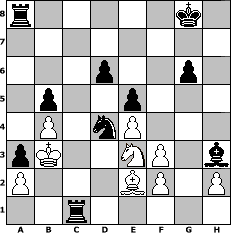 game notation in PGN-format [Event "unter uns Nr. 26"] [Site "www.myChess.de"] [Date "2015.02.14"] [Round "1"] [White "borsti"] [Black "Haneken"] [ECO "C24"] [WhitemyELO "1388"] [BlackmyELO "1009"] [Result "0-1"] [TimeControl "10/864000"] [WhiteDays "40"] [BlackDays "37"] [MyChessNo "98137"] 1. e4 e5 2. Bc4 Nf6 3. d3 Bb4+ 4. Bd2 Bxd2+ 5. Qxd2 Nc6 6. Nc3 Nd4 7. Nf3 Nxf3+ 8. gxf3 O-O 9. Qg5 g6 10. O-O-O Nh5 11. Qh6 d6 12. Rdg1 Qh4 13. Nd1 c6 14. Rg2 Bh3 15. Rxg6+ hxg6 16. Qxg6+ Ng7 17. Rg1 Qh7 18. Ne3 Qxg6 19. Rxg6 b5 20. Bb3 a5 21. c4 fxg6 22. Bd1 a4 23. cxb5 cxb5 24. Nd5 Rac8+ 25. Kd2 Ra8 26. Kc3 a3 27. b4 Rac8+ 28. Kb3 Rc1 29. Be2 Bg2 30. Ne3 Bh3 31. Ng4 Ra8 32. Ne3 Ne6 33. d4 Nxd4# 0-1 position notation in FEN-format r5k1/8/3p2p1/1p2p3/1P1nP3/pK2NP1b/P3BP1P/2r5 - - - 0 34 Captured white pieces: ![]() ![]() ![]() ![]() ![]() ![]() ![]() ![]() ![]() ![]() ![]() ![]() ![]() ![]() ![]() Captured black pieces: ![]() ![]() ![]() ![]() ![]() ![]() ![]() ![]() ![]() ![]() ![]() ![]() ![]() ![]() ![]() Click on a captured piece in order to display the desired move!
