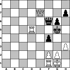 game notation in PGN-format [Event "Sommerpausen-F"] [Site "www.myChess.de"] [Date "2013.07.07"] [Round "1"] [White "Gauss1233"] [Black "reisender"] [ECO "A40"] [WhitemyELO "1396"] [BlackmyELO "1410"] [Result "1-0"] [TimeControl "10/2592000"] [WhiteDays "125"] [BlackDays "149"] [MyChessNo "89166"] 1. d4 g6 2. c4 Bg7 3. Nc3 Nc6 4. e3 d6 5. Nf3 Bg4 6. Be2 Nf6 7. d5 Nb4 8. a3 Na6 9. Qd2 O-O 10. O-O Nc5 11. Qd1 e5 12. h3 Bxf3 13. Bxf3 Rc8 14. e4 c6 15. b4 Ncd7 16. Qe2 cxd5 17. exd5 b5 18. Ne4 Rxc4 19. Nxd6 Rh4 20. Bg5 Rd4 21. Nxb5 Qb6 22. Nxd4 exd4 23. Rac1 Re8 24. Qd3 Ne5 25. Qd1 Nxf3+ 26. Qxf3 Ne4 27. Qg4 d3 28. Rc6 Qd4 29. Be3 Qxd5 30. Rcc1 Bb2 31. Rc7 Bxa3 32. Rxa7 Bxb4 33. Rd7 Qc6 34. Rxd3 f5 35. Qd1 Rf8 36. Qb3+ Kg7 37. Qxb4 f4 38. Bd4+ Kh6 39. Qxf8+ Kg5 40. Qe7+ Nf6 41. Bxf6+ Qxf6 42. Rd5+ 1-0 position notation in FEN-format 8/4Q2p/5qp1/3R2k1/5p2/7P/5PP1/5RK1 - - - 1 42 Captured white pieces: Captured black pieces: Click on a captured piece in order to display the desired move!