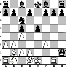 game notation in PGN-format [Event "Opera "] [Site "www.myChess.de"] [Date "2025.09.04"] [Round "1"] [White "Hobbykegler"] [Black "Achimkogge"] [ECO "A30"] [WhitemyELO "1012"] [BlackmyELO "1216"] [Result "0-1"] [TimeControl "10/2592000"] [WhiteDays "45"] [BlackDays "59"] [MyChessNo "133636"] 1. c4 c5 2. b3 Nc6 3. Bb2 e5 4. e4 Nf6 5. a3 Nxe4 6. Nh3 Qf6 7. f3 Qh4+ 8. g3 Nxg3 9. Rg1 Nxf1+ 10. Kxf1 Qxh3+ 11. Ke1 Qxh2 0-1 position notation in FEN-format r1b1kb1r/pp1p1ppp/2n5/2p1p3/2P5/PP3P2/1BPP3q/RN1QK1R1 - kq - 0 12 Captured white pieces: Captured black pieces: Click on a captured piece in order to display the desired move!