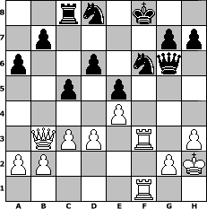 game notation in PGN-format [Event "Die letzten Sommertage!!! Teil2"] [Site "www.myChess.de"] [Date "2009.09.14"] [Round "1"] [White "Andylein1989"] [Black "HenrySchinasky"] [ECO "B02"] [WhitemyELO "1537"] [BlackmyELO "2106"] [Result "0-1"] [TimeControl "10/864000"] [WhiteDays "00"] [BlackDays "23"] [MyChessNo "59016"] 1. e4 Nf6 2. Nc3 e5 3. Bc4 Bc5 4. Nf3 d6 5. d3 O-O 6. O-O a6 7. h3 Be6 8. Bxe6 fxe6 9. Be3 Bxe3 10. fxe3 c5 11. Ng5 Qd7 12. Ne2 Nc6 13. Ng3 Qe8 14. c3 Qg6 15. Nxe6 Qxg3 16. Nxf8 Qxe3+ 17. Kh1 Kxf8 18. Rf3 Qg5 19. Qb3 Nd8 20. Raf1 Rc8 21. Kh2 Qg6 0-1 position notation in FEN-format 2rn1k2/1p4pp/p2p1nq1/2p1p3/4P3/1QPP1R1P/PP4PK/5R2 - - - 8 22 Captured white pieces: ![]() ![]() ![]() ![]() ![]() ![]() ![]() ![]() ![]() ![]() ![]() ![]() ![]() ![]() ![]() Captured black pieces: ![]() ![]() ![]() ![]() ![]() ![]() ![]() ![]() ![]() ![]() ![]() ![]() ![]() ![]() ![]() Click on a captured piece in order to display the desired move!