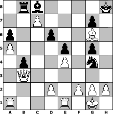 game notation in PGN-format [Event "Abtausch Variante"] [Site "www.myChess.de"] [Date "2007.02.05"] [Round "1"] [White "Meta"] [Black "LeeBrilleaux"] [ECO "D35"] [WhitemyELO "2155"] [BlackmyELO "1472"] [Result "1-0"] [TimeControl "10/1728000"] [WhiteDays "80"] [BlackDays "77"] [MyChessNo "32283"] 1. d4 d5 2. c4 e6 3. Nc3 Nf6 4. cxd5 Nxd5 5. e4 Nb6 6. Nf3 Nc6 7. Bb5 Bb4 8. a3 Bxc3+ 9. bxc3 O-O 10. O-O Re8 11. a4 a6 12. Bd3 e5 13. a5 Nd7 14. d5 Ne7 15. Bc2 Ng6 16. Ba4 b5 17. Bb3 Nf6 18. Re1 Qd6 19. c4 b4 20. Qc2 Ng4 21. c5 Qf6 22. Bg5 Qxg5 23. Nxg5 Bd7 24. c6 Bc8 25. d6 cxd6 26. Bxf7+ Kh8 27. Bxe8 h6 28. Bxg6 hxg5 29. Qb3 Rb8 30. c7 1-0 position notation in FEN-format 1rb4k/2P3p1/p2p2B1/P3p1p1/1p2P1n1/1Q6/3P1PPP/R3R1K1 - - - 0 30 Captured white pieces: Captured black pieces: Click on a captured piece in order to display the desired move!