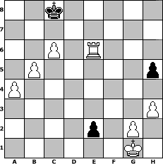 game notation in PGN-format [Event "Vereinsmeisterschaft YUGZ 2008-2009"] [Site "www.myChess.de"] [Date "2008.12.15"] [Round "1"] [White "crca108"] [Black "Biber"] [ECO "C20"] [WhitemyELO "1376"] [BlackmyELO "1217"] [Result "1-0"] [TimeControl "10/2592000"] [WhiteDays "105"] [BlackDays "087"] [MyChessNo "50725"] 1. e4 e5 2. Qh5 Qe7 3. b3 g6 4. Qf3 d6 5. Bb2 Nc6 6. c3 Nf6 7. h3 d5 8. exd5 Nxd5 9. Qxd5 f6 10. Bb5 Qd7 11. Bxc6 Qxc6 12. Qxc6+ bxc6 13. Nf3 Bd6 14. O-O O-O 15. a4 Be6 16. c4 Bf5 17. Nh4 Bb4 18. Nxf5 gxf5 19. Ba3 Bxa3 20. Nxa3 f4 21. c5 Rad8 22. Nc4 Rd5 23. b4 Rd4 24. Rac1 Rfd8 25. Na5 R8d5 26. Nxc6 Rxd2 27. Ne7+ Kf7 28. Nxd5 Rxd5 29. Rcd1 Rxd1 30. Rxd1 Ke7 31. c6 h5 32. Rd7+ Ke8 33. Rxc7 Kd8 34. Rxa7 Kc8 35. b5 e4 36. Rf7 e3 37. fxe3 fxe3 38. Rxf6 e2 39. Re6 1-0 position notation in FEN-format 2k5/8/2P1R3/1P5p/P7/7P/4p1P1/6K1 - - - 1 39 Captured white pieces: Captured black pieces: Click on a captured piece in order to display the desired move!