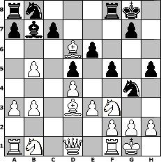 game notation in PGN-format [Event "1.Schaltjahresturnier@mySchach"] [Site "www.myChess.de"] [Date "2004.02.29"] [Round "2"] [White "HPB2005"] [Black "Bitworm"] [ECO "A01"] [WhitemyELO "1625"] [BlackmyELO "1387"] [Result "1-0"] [TimeControl "10/1728000"] [WhiteDays "39"] [BlackDays "00"] [MyChessNo "2652"] 1. b3 e6 2. Bb2 Nf6 3. e3 Bc5 4. d4 Bb4+ 5. c3 O-O 6. cxb4 d5 7. Bd3 Nc6 8. a3 b5 9. Bxb5 Qd6 10. Nf3 Nb8 11. Bd3 Ba6 12. b5 Bb7 13. O-O Ng4 14. Bc3 f5 15. Bb4 h5 16. Bxd6 1-0 position notation in FEN-format rn3rk1/pbp3p1/3Bp3/1P1p1p1p/3P2n1/PP1BPN2/5PPP/RN1Q1RK1 - - - 0 16 Captured white pieces: Captured black pieces: Click on a captured piece in order to display the desired move!