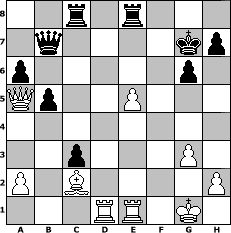 game notation in PGN-format [Event "Verschachert # 4"] [Site "www.myChess.de"] [Date "2013.05.12"] [Round "1"] [White "Macks"] [Black "Knight"] [ECO "A40"] [WhitemyELO "1175"] [BlackmyELO "1222"] [Result "1-0"] [TimeControl "10/1728000"] [WhiteDays "100"] [BlackDays "098"] [MyChessNo "88313"] 1. d4 e5 2. dxe5 Nc6 3. Nf3 Qe7 4. Bf4 Qb4+ 5. Nc3 Qxb2 6. Nd5 Bb4+ 7. Nxb4 Qxb4+ 8. Bd2 Qc5 9. e3 Nxe5 10. Nxe5 Qxe5 11. Bd3 Nf6 12. O-O O-O 13. Bb4 c5 14. Ba3 d6 15. Rb1 b6 16. Bb2 Qe7 17. c4 d5 18. cxd5 Rd8 19. Bxf6 Qxf6 20. Bc2 Ba6 21. Re1 Bb7 22. Qd3 g6 23. e4 a6 24. e5 Qg5 25. Bb3 b5 26. Qe2 c4 27. Bc2 Bxd5 28. f3 Re8 29. Rbd1 f6 30. Rxd5 Qf4 31. g3 Qh6 32. f4 fxe5 33. fxe5 Rac8 34. Qd2 Qg7 35. Qa5 Qb7 36. Be4 c3 37. Rdd1 Qa7+ 38. Kh1 Kg7 39. Bc2 Qb7+ 40. Kg1 1-0 position notation in FEN-format 2r1r3/1q4kp/p5p1/Qp2P3/8/2p3P1/P1B4P/3RR1K1 - - - 7 40 Captured white pieces: Captured black pieces: Click on a captured piece in order to display the desired move!