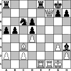 game notation in PGN-format [Event "unter uns Nr. 17"] [Site "www.myChess.de"] [Date "2014.02.13"] [Round "1"] [White "Knight"] [Black "Schefsche"] [ECO "A00"] [WhitemyELO "1233"] [BlackmyELO "1427"] [Result "1-0"] [TimeControl "10/864000"] [WhiteDays "29"] [BlackDays "22"] [MyChessNo "92915"] 1. b4 e5 2. Bb2 e4 3. e3 Nf6 4. Nc3 Bxb4 5. d3 O-O 6. d4 Nd5 7. Nge2 Nc6 8. g3 d6 9. Bg2 Re8 10. O-O Bxc3 11. Nxc3 Nxc3 12. Bxc3 d5 13. f4 exf3 14. Qxf3 Be6 15. Rae1 a5 16. e4 Qd6 17. e5 b5 18. exd6 cxd6 19. Bh3 Bxh3 20. Qxf7+ 1-0 position notation in FEN-format r3r1k1/5Qpp/2np4/pp1p4/3P4/2B3Pb/P1P4P/4RRK1 - - - 0 20 Captured white pieces: Captured black pieces: Click on a captured piece in order to display the desired move!