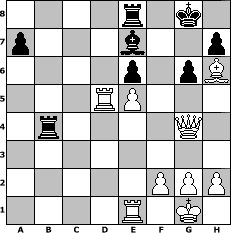 game notation in PGN-format [Event "Herbstturnier 2004"] [Site "www.myChess.de"] [Date "2004.09.02"] [Round "1"] [White "torsten64"] [Black "helrobe"] [ECO "A50"] [WhitemyELO "1836"] [BlackmyELO "1601"] [Result "1/2-1/2"] [TimeControl "10/2592000"] [WhiteDays "84"] [BlackDays "63"] [MyChessNo "6493"] 1. d4 Nf6 2. c4 d5 3. cxd5 Nxd5 4. Nf3 e6 5. e4 Nf6 6. Nc3 Be7 7. Bd3 O-O 8. O-O Nc6 9. Re1 Nb4 10. Bb1 c5 11. e5 Nfd5 12. Nxd5 Nxd5 13. Qc2 g6 14. Bh6 Re8 15. dxc5 Bd7 16. a3 Rc8 17. Qd2 Rxc5 18. b4 Rc7 19. Be4 Bc6 20. Nd4 Ba4 21. Rac1 Rd7 22. Qb2 Nxb4 23. Nxe6 fxe6 24. axb4 Rd4 25. Bxb7 Rxb4 26. Qa1 Rxb7 27. Qxa4 Qd7 28. Qg4 Qd5 29. Rcd1 Rb4 30. Rxd5 1/2-1/2 position notation in FEN-format 4r1k1/p3b2p/4p1pB/3RP3/1r4Q1/8/5PPP/4R1K1 - - - 0 30 Captured white pieces: ![]() ![]() ![]() ![]() ![]() ![]() ![]() ![]() ![]() ![]() ![]() ![]() ![]() ![]() ![]() Captured black pieces: ![]() ![]() ![]() ![]() ![]() ![]() ![]() ![]() ![]() ![]() ![]() ![]() ![]() ![]() ![]() Click on a captured piece in order to display the desired move!
