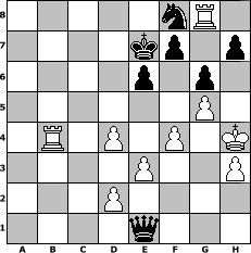 game notation in PGN-format [Event "Prätorianer"] [Site "www.myChess.de"] [Date "2023.01.04"] [Round "1"] [White "skuehnel"] [Black "wolni55"] [ECO "D20"] [WhitemyELO "1294"] [BlackmyELO "1462"] [Result "0-1"] [TimeControl "10/1728000"] [WhiteDays "17"] [BlackDays "20"] [MyChessNo "128922"] 1. d4 d5 2. c4 dxc4 3. e3 b5 4. Nc3 a6 5. b4 Nc6 6. a4 Nxb4 7. Ba3 Nd5 8. Nxd5 Qxd5 9. axb5 axb5 10. Nf3 Bf5 11. g3 Bg4 12. Be2 e6 13. Bxf8 Kxf8 14. h3 Bf5 15. g4 Be4 16. O-O Ne7 17. Ne5 Bg2 18. Bf3 Bxf3 19. Nd7+ Qxd7 20. Rxa8+ Nc8 21. Qxf3 g6 22. Rfa1 Ke7 23. Qb7 c6 24. Qb8 Qd8 25. g5 Nb6 26. Qb7+ Qd7 27. Qxd7+ Nxd7 28. Rxh8 Nf8 29. Ra7+ Ke8 30. Rc7 c3 31. Rxc6 b4 32. Rb6 c2 33. Rxb4 c1=Q+ 34. Kg2 Qc6+ 35. f3 Qc2+ 36. Kg3 Qc7+ 37. f4 Ke7 38. Rg8 Qc6 39. Kg4 Qg2+ 40. Kh4 Qf2+ 41. Kg4 Qe2+ 42. Kh4 Qe1+ 0-1 position notation in FEN-format 5nR1/4kp1p/4p1p1/6P1/1R1P1P1K/4P2P/3P4/4q3 - - - 11 43 Captured white pieces: Captured black pieces: Click on a captured piece in order to display the desired move!