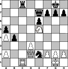 game notation in PGN-format [Event "AE Blitzturnier"] [Site "www.myChess.de"] [Date "2006.03.07"] [Round "2"] [White "reisinger"] [Black "torsten64"] [ECO "B50"] [WhitemyELO "1764"] [BlackmyELO "1925"] [Result "0-1"] [TimeControl "10/86400"] [WhiteDays "03"] [BlackDays "03"] [MyChessNo "23275"] 1. e4 c5 2. Nf3 d6 3. Bc4 e6 4. Nc3 Nf6 5. O-O Be7 6. Re1 O-O 7. d4 cxd4 8. Nxd4 Qc7 9. Qe2 a6 10. Bg5 Nbd7 11. Rad1 b5 12. Bd3 Bb7 13. Nf3 b4 14. Na4 Bc6 15. b3 Bxa4 16. bxa4 Nc5 17. Rb1 a5 18. e5 Nxd3 19. cxd3 Nd5 20. Rbc1 Nc3 21. Qc2 dxe5 22. Bxe7 Qxe7 23. Nxe5 Rfc8 24. Nc4 Rc5 25. Re5 Rxe5 26. Nxe5 Rc8 27. Qd2 Ne2+ 0-1 position notation in FEN-format 2r3k1/4qppp/4p3/p3N3/Pp6/3P4/P2QnPPP/2R3K1 - - - 3 28 Captured white pieces: Captured black pieces: Click on a captured piece in order to display the desired move!