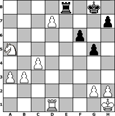 game notation in PGN-format [Event "K"] [Site "www.myChess.de"] [Date "2009.06.03"] [Round "1"] [White "Caligula"] [Black "Steppenwolf"] [ECO "C36"] [WhitemyELO "1284"] [BlackmyELO "1206"] [Result "1-0"] [TimeControl "10/2592000"] [WhiteDays "30"] [BlackDays "30"] [MyChessNo "56350"] 1. e4 e5 2. f4 exf4 3. Nf3 d5 4. exd5 Nf6 5. d3 Qxd5 6. Bxf4 Bd6 7. Nc3 Qc5 8. d4 Qf5 9. Qe2+ Qe6 10. Bxd6 Qxe2+ 11. Bxe2 cxd6 12. O-O Bg4 13. Bb5+ Nc6 14. d5 a6 15. Bd3 Nb4 16. Ne1 O-O 17. Bc4 b5 18. Bb3 a5 19. a3 Na6 20. Nxb5 Rfd8 21. c4 Nc5 22. Bc2 Be2 23. Rf4 Nh5 24. Rd4 Rab8 25. Nc3 Nb3 26. Bxb3 Rxb3 27. Rb1 Rc8 28. Nxe2 Re8 29. Nc3 Rb7 30. Ne4 Nf4 31. Nxd6 Ne2+ 32. Kh1 Nxd4 33. Nxb7 Re2 34. Nxa5 Nc2 35. Nxc2 Rxc2 36. Re1 f6 37. b3 g5 38. Rd1 Re2 39. d6 Re8 40. d7 1-0 position notation in FEN-format 4r1k1/3P3p/5p2/N5p1/2P5/PP6/6PP/3R3K - - - 0 40 Captured white pieces: Captured black pieces: Click on a captured piece in order to display the desired move!