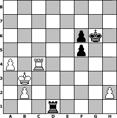 game notation in PGN-format [Event "1. Chess960/6"] [Site "www.myChess.de"] [Date "2007.03.01"] [Round "1"] [White "Offi@ (adv.)"] [Black "GPogrzeba@ (adv.)"] [Variant "Fischerrandom"] [SetUp "1"] [FEN "rbqkbrnn/pppppppp/8/8/8/8/PPPPPPPP/RBQKBRNN w KQkq - 0 1"] [WhitemyELO "1500"] [BlackmyELO "1500"] [Result "1-0"] [TimeControl "10/3456000"] [WhiteDays "193"] [BlackDays "176"] [MyChessNo "33171"] 1. Nf3 Nf6 2. c4 c5 3. Ng3 Ng6 4. Nf5 Nf4 5. d4 g6 6. g3 gxf5 7. gxf4 d5 8. cxd5 Nxd5 9. Qxc5 Qe6 10. Bd3 Bxf4 11. Bd2 b6 12. Qa3 Rg8 13. O-O-O a5 14. Bxf4 Nxf4 15. Kb1 Nxd3 16. Rxd3 Rc8 17. Rc3 Rxc3 18. Qxc3 f6 19. Rc1 Bd7 20. Nd2 Qxe2 21. Nc4 Qe4+ 22. Ka1 Qc6 23. Qd2 Qe4 24. Nxb6 Ke8 25. a4 Rg4 26. Nxd7 Kxd7 27. Qxa5 Qxd4 28. Qb5+ Ke6 29. Qb3+ Ke5 30. Re1+ Kf4 31. Rxe7 Qxf2 32. Rxh7 Qe3 33. Qb8+ Qe5 34. Rc7 Rg1+ 35. Ka2 Qd5+ 36. Rc4+ Kg5 37. Qf4+ Kg6 38. Qd4 Qh1 39. Qd7 Rc1 40. Rh4 Ra1+ 41. Kb3 Qd1+ 42. Qxd1 Rxd1 43. Rc4 1-0 position notation in FEN-format 8/8/5pk1/5p2/P1R5/1K6/1P5P/3r4 - - - 1 43 Captured white pieces: Captured black pieces: Click on a captured piece in order to display the desired move!