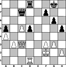 game notation in PGN-format [Event "Sommeranfang 2013"] [Site "www.myChess.de"] [Date "2013.06.21"] [Round "1"] [Board "1"] [White "nyffhans"] [Black "Grubengeist"] [ECO "D02"] [WhitemyELO "2065"] [BlackmyELO "1951"] [Result "1/2-1/2"] [TimeControl "10/2592000"] [WhiteDays "30"] [BlackDays "30"] [MyChessNo "88934"] 1. d4 d5 2. Nf3 c6 3. c4 dxc4 4. e3 Be6 5. Nbd2 Qa5 6. Be2 Nf6 7. O-O b5 8. a4 g6 9. Ng5 Bc8 10. Nde4 b4 11. Qc2 Nxe4 12. Nxe4 Nd7 13. Qxc4 Bb7 14. f3 e6 15. Bd2 Be7 16. Nc5 Qc7 17. Bxb4 a5 18. Be1 Nxc5 19. dxc5 O-O 20. Bg3 Qc8 21. Qc3 Rd8 22. Rad1 Rd5 23. Rxd5 exd5 24. e4 Bf8 25. exd5 cxd5 26. Rc1 Bc6 27. Bb5 Bg7 28. Be5 Bxe5 29. Qxe5 Qb7 30. Bxc6 Qxc6 31. b3 Re8 32. Qc3 Qc7 33. Rd1 Rd8 34. g3 h5 35. Kf2 1/2-1/2 position notation in FEN-format 3r2k1/2q2p2/6p1/p1Pp3p/P7/1PQ2PP1/5K1P/3R4 - - - 1 35 Captured white pieces: Captured black pieces: Click on a captured piece in order to display the desired move!