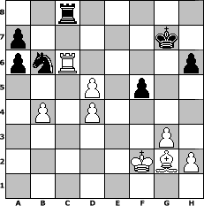 game notation in PGN-format [Event "1.Brefelder Open"] [Site "www.myChess.de"] [Date "2014.10.20"] [Round "2"] [White "Helmut48"] [Black "alibengali"] [ECO "B20"] [WhitemyELO "1975"] [BlackmyELO "1609"] [Result "1-0"] [TimeControl "10/2592000"] [WhiteDays "118"] [BlackDays "107"] [MyChessNo "96434"] 1. e4 c5 2. g3 g6 3. Nc3 Bg7 4. Bg2 e5 5. d3 Nf6 6. Bg5 h6 7. Bxf6 Bxf6 8. Nd5 Nc6 9. c3 d6 10. Ne2 Be6 11. O-O Bxd5 12. exd5 Nb8 13. f4 Nd7 14. fxe5 Bxe5 15. Qb3 Qb6 16. Qxb6 Nxb6 17. a4 O-O 18. a5 Nd7 19. d4 cxd4 20. cxd4 Bg7 21. Rfc1 Rfe8 22. Kf1 Rac8 23. b4 f5 24. a6 Rxc1+ 25. Rxc1 bxa6 26. Rc6 Bf8 27. Nf4 Nb6 28. Nxg6 Kf7 29. Nxf8 Kxf8 30. Rxd6 Kg7 31. Kf2 Rc8 32. Rc6 1-0 position notation in FEN-format 2r5/p5k1/pnR4p/3P1p2/1P1P4/6P1/5KBP/8 - - - 4 32 Captured white pieces: ![]() ![]() ![]() ![]() ![]() ![]() ![]() ![]() ![]() ![]() ![]() ![]() ![]() ![]() ![]() Captured black pieces: ![]() ![]() ![]() ![]() ![]() ![]() ![]() ![]() ![]() ![]() ![]() ![]() ![]() ![]() ![]() Click on a captured piece in order to display the desired move!