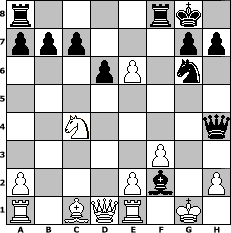 game notation in PGN-format [Event "Hoffnung"] [Site "www.myChess.de"] [Date "2017.03.10"] [Round "1"] [White "Knight"] [Black "espero"] [ECO "C51"] [WhitemyELO "1179"] [BlackmyELO "1833"] [Result "0-1"] [TimeControl "10/1728000"] [WhiteDays "20"] [BlackDays "15"] [MyChessNo "107276"] 1. e4 e5 2. Nf3 Nc6 3. Bc4 Bc5 4. b4 Bxb4 5. c3 Bc5 6. d4 exd4 7. O-O d6 8. cxd4 Bb6 9. d5 Na5 10. Bb2 Ne7 11. Nbd2 O-O 12. Re1 Nxc4 13. Nxc4 Bg4 14. e5 Ng6 15. e6 fxe6 16. dxe6 Bxf3 17. gxf3 Qh4 18. Bc1 Bxf2+ 0-1 position notation in FEN-format r4rk1/ppp3pp/3pP1n1/8/2N4q/5P2/P3Pb1P/R1BQR1K1 - - - 0 19 Captured white pieces: Captured black pieces: Click on a captured piece in order to display the desired move!