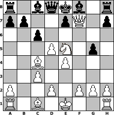 game notation in PGN-format [Event "Loyal to the Game"] [Site "www.myChess.de"] [Date "2005.12.23"] [Round "1"] [White "Naunhofer"] [Black "Andi56"] [ECO "D20"] [WhitemyELO "1620"] [BlackmyELO "931"] [Result "1-0"] [TimeControl "10/864000"] [WhiteDays "10"] [BlackDays "10"] [MyChessNo "21002"] 1. d4 d5 2. c4 dxc4 3. Nc3 Nf6 4. Nf3 Nd5 5. e4 Nxc3 6. bxc3 Nc6 7. Bxc4 g6 8. d5 Ne5 9. Nxe5 c6 10. Qf3 g5 11. Qxf7# 1-0 position notation in FEN-format r1bqkb1r/pp2pQ1p/2p5/3PN1p1/2B1P3/2P5/P2P1PPP/R1B1K2R - KQkq - 0 11 Captured white pieces: Captured black pieces: Click on a captured piece in order to display the desired move!