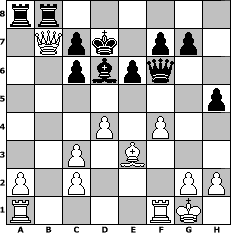 game notation in PGN-format [Event "Aljechin Verteidigung"] [Site "www.myChess.de"] [Date "2006.01.30"] [Round "1"] [White "Knight"] [Black "Juri"] [ECO "B05"] [WhitemyELO "1230"] [BlackmyELO "1589"] [Result "0-1"] [TimeControl "10/864000"] [WhiteDays "20"] [BlackDays "19"] [MyChessNo "22053"] 1. e4 Nf6 2. e5 Nd5 3. d4 d6 4. Nf3 Bg4 5. Be2 Nc6 6. exd6 Qxd6 7. O-O O-O-O 8. Nc3 Nxc3 9. bxc3 Bxf3 10. Bxf3 Qf6 11. Be3 e6 12. Qd2 Bc5 13. Bxc6 bxc6 14. Qe2 Bd6 15. f4 h5 16. Qa6+ Kd7 17. Qxa7 Ra8 18. Qb7 Rhb8 0-1 position notation in FEN-format rr6/1Qpk1pp1/2pbpq2/7p/3P1P2/2P1B3/P1P3PP/R4RK1 - - - 3 19 Captured white pieces: Captured black pieces: Click on a captured piece in order to display the desired move!