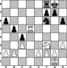 game notation in PGN-format [Event "und immer wieder Schach !"] [Site "www.myChess.de"] [Date "2009.11.06"] [Round "1"] [White "Joschi"] [Black "Haki"] [ECO "C66"] [WhitemyELO "1562"] [BlackmyELO "1478"] [Result "1/2-1/2"] [TimeControl "10/864000"] [WhiteDays "29"] [BlackDays "28"] [MyChessNo "60374"] 1. e4 e5 2. Nf3 Nc6 3. Bb5 Nf6 4. O-O d6 5. Re1 a6 6. Ba4 b5 7. Bb3 Be7 8. h3 O-O 9. c3 Bb7 10. d4 Na5 11. Bc2 c6 12. dxe5 dxe5 13. Nxe5 Qxd1 14. Rxd1 c5 15. Nd2 Rad8 16. Re1 Nc6 17. Ndf3 h6 18. Bf4 Nxe5 19. Nxe5 Bd6 20. Nd3 Bxe4 21. Bxd6 Rxd6 22. Red1 Nd7 23. Ne1 Rxd1 24. Rxd1 Nf6 25. Bxe4 Nxe4 26. Rd5 c4 27. Nf3 Nf6 1/2-1/2 position notation in FEN-format 5rk1/5pp1/p4n1p/1p1R4/2p5/2P2N1P/PP2PPP1/6K1 - - - 2 28 Captured white pieces: Captured black pieces: Click on a captured piece in order to display the desired move!