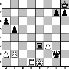 game notation in PGN-format [Event "In Memorium Michael Knopf 4"] [Site "www.myChess.de"] [Date "2015.04.10"] [Round "1"] [White "Joschi"] [Black "pepo47"] [ECO "B33"] [WhitemyELO "1587"] [BlackmyELO "2077"] [Result "0-1"] [TimeControl "10/2592000"] [WhiteDays "120"] [BlackDays "113"] [MyChessNo "98921"] 1. e4 c5 2. Nf3 Nc6 3. d4 cxd4 4. Nxd4 Nf6 5. Nc3 e5 6. Ndb5 d6 7. Bg5 a6 8. Na3 b5 9. Nd5 Be7 10. Bxf6 Bxf6 11. Be2 Bg5 12. c3 Ne7 13. Nxe7 Qxe7 14. Qd3 O-O 15. Nc2 Bb7 16. Ne3 Bxe3 17. Qxe3 f5 18. Bf3 d5 19. exf5 Rxf5 20. O-O d4 21. cxd4 Bxf3 22. gxf3 Raf8 23. dxe5 Rxe5 24. Qb3+ Kh8 25. Rad1 Qh4 26. f4 Qxf4 27. f3 Re2 28. Rf2 Rxf2 29. Kxf2 Qxh2+ 30. Ke1 Qg3+ 31. Ke2 Qg2+ 32. Ke1 Re8+ 33. Qe3 Rxe3# 0-1 position notation in FEN-format 7k/6pp/p7/1p6/8/4rP2/PP4q1/3RK3 - - - 0 34 Captured white pieces: ![]() ![]() ![]() ![]() ![]() ![]() ![]() ![]() ![]() ![]() ![]() ![]() ![]() ![]() ![]() Captured black pieces: ![]() ![]() ![]() ![]() ![]() ![]() ![]() ![]() ![]() ![]() ![]() ![]() ![]() ![]() ![]() Click on a captured piece in order to display the desired move!