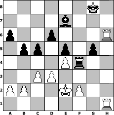 game notation in PGN-format [Event "April 2018"] [Site "www.myChess.de"] [Date "2018.04.11"] [Round "1"] [White "Andylein1989"] [Black "reisinger"] [ECO "B30"] [WhitemyELO "1704"] [BlackmyELO "1459"] [Result "1-0"] [TimeControl "10/1728000"] [WhiteDays "80"] [BlackDays "80"] [MyChessNo "111919"] 1. e4 c5 2. Nf3 Nc6 3. Bb5 d6 4. c3 Bd7 5. Ba4 a6 6. d3 b5 7. Bc2 h6 8. Nbd2 Nf6 9. Nf1 e6 10. Ng3 Be7 11. Bd2 O-O 12. Qc1 Nh7 13. Nh5 g5 14. h4 f6 15. hxg5 fxg5 16. Ng3 Rxf3 17. gxf3 Qf8 18. f4 Qg7 19. fxg5 Nxg5 20. Qd1 Rf8 21. Bxg5 Qxg5 22. Qh5 Rf6 23. Qxg5+ hxg5 24. Ke2 Ne5 25. Raf1 Ng6 26. Nh5 Nf4+ 27. Nxf4 Rxf4 28. Rh6 e5 29. Bd1 Bg4+ 30. Kd2 Bxd1 31. Kxd1 Rf3 32. Ke2 Rf4 33. Rfh1 1-0 position notation in FEN-format 6k1/4b3/p2p3R/1pp1p1p1/4Pr2/2PP4/PP2KP2/7R - - - 4 33 Captured white pieces: ![]() ![]() ![]() ![]() ![]() ![]() ![]() ![]() ![]() ![]() ![]() ![]() ![]() ![]() ![]() Captured black pieces: ![]() ![]() ![]() ![]() ![]() ![]() ![]() ![]() ![]() ![]() ![]() ![]() ![]() ![]() ![]() Click on a captured piece in order to display the desired move!