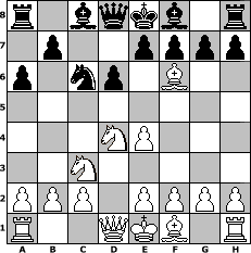 game notation in PGN-format [Event "Sizialianisch"] [Site "www.myChess.de"] [Date "2007.06.22"] [Round "1"] [White "Andylein1989"] [Black "Greenarcher"] [ECO "B94"] [WhitemyELO "1536"] [BlackmyELO "1552"] [Result "1-0"] [TimeControl "10/864000"] [WhiteDays "07"] [BlackDays "00"] [MyChessNo "35827"] 1. e4 c5 2. Nf3 d6 3. d4 cxd4 4. Nxd4 Nf6 5. Nc3 a6 6. Bg5 Nc6 7. Bxf6 1-0 position notation in FEN-format r1bqkb1r/1p2pppp/p1np1B2/8/3NP3/2N5/PPP1PPPP/R2QKB1R - KQkq - 0 7 Captured white pieces: ![]() ![]() ![]() ![]() ![]() ![]() ![]() ![]() ![]() ![]() ![]() ![]() ![]() ![]() ![]() Captured black pieces: ![]() ![]() ![]() ![]() ![]() ![]() ![]() ![]() ![]() ![]() ![]() ![]() ![]() ![]() ![]() Click on a captured piece in order to display the desired move!