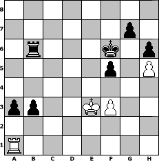 game notation in PGN-format [Event "Sommerferien 2010"] [Site "www.myChess.de"] [Date "2010.06.20"] [Round "1"] [White "Winston"] [Black "sprinterde"] [ECO "C00"] [WhitemyELO "1467"] [BlackmyELO "1668"] [Result "0-1"] [TimeControl "10/2592000"] [WhiteDays "180"] [BlackDays "178"] [MyChessNo "66407"] 1. e4 e6 2. a3 Nf6 3. Nc3 b6 4. e5 Ng8 5. Nf3 d6 6. d4 Bb7 7. Bf4 Nd7 8. Bb5 a6 9. Bxd7+ Qxd7 10. O-O Ne7 11. Re1 Ng6 12. Qd2 Bxf3 13. gxf3 dxe5 14. Bxe5 Nxe5 15. Rxe5 Bd6 16. Re2 O-O 17. Qd3 Qe7 18. Ne4 Rfd8 19. c3 Bf4 20. h3 c5 21. Kg2 cxd4 22. cxd4 Be5 23. Rh1 Rxd4 24. Qc2 Qd8 25. h4 Rc8 26. Qb1 h6 27. Ree1 Bf4 28. Nc3 Bd2 29. Rd1 Bxc3 30. bxc3 Rxc3 31. a4 Rcc4 32. Rxd4 Rxd4 33. a5 bxa5 34. h5 Qg5+ 35. Kf1 Qb5+ 36. Qxb5 axb5 37. Ke2 a4 38. Ke3 Rd5 39. Ra1 f5 40. f4 Kf7 41. Ra2 Kf6 42. Rc2 e5 43. Rc6+ Ke7 44. fxe5 Rxe5+ 45. Kf4 Re6 46. Rc7+ Kf6 47. f3 a3 48. Rc1 b4 49. Ra1 Rb6 50. Ke3 b3 0-1 position notation in FEN-format 8/6p1/1r3k1p/5p1P/8/pp2KP2/8/R7 - - - 0 51 Captured white pieces: Captured black pieces: Click on a captured piece in order to display the desired move!