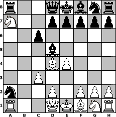 game notation in PGN-format [Event "Hauptsache SPASS"] [Site "www.myChess.de"] [Date "2003.11.30"] [Round "1"] [White "Pumphut"] [Black "Graue70"] [ECO "A00"] [WhitemyELO "1371"] [BlackmyELO "1380"] [Result "1-0"] [TimeControl "10/2592000"] [WhiteDays "29"] [BlackDays "00"] [MyChessNo "1527"] 1. b4 b5 2. Bb2 Bb7 3. Bd4 Bd5 4. Nc3 Nc6 5. Nxb5 Nxb4 6. c3 c6 7. Nxa7 Nxa2 8. e4 1-0 position notation in FEN-format r2qkbnr/N2ppppp/2p5/3b4/3BP3/2P5/n2P1PPP/R2QKBNR - KQkq - 0 8 Captured white pieces: ![]() ![]() ![]() ![]() ![]() ![]() ![]() ![]() ![]() ![]() ![]() ![]() ![]() ![]() ![]() Captured black pieces: ![]() ![]() ![]() ![]() ![]() ![]() ![]() ![]() ![]() ![]() ![]() ![]() ![]() ![]() ![]() Click on a captured piece in order to display the desired move!