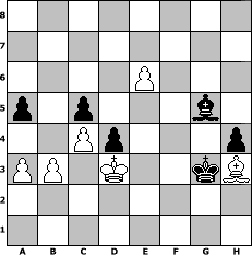 game notation in PGN-format [Event "Unter uns!"] [Site "www.myChess.de"] [Date "2013.02.26"] [Round "1"] [White "Haki"] [Black "borsti"] [ECO "C41"] [WhitemyELO "1224"] [BlackmyELO "1255"] [Result "0-1"] [TimeControl "10/1728000"] [WhiteDays "100"] [BlackDays "100"] [MyChessNo "86831"] 1. e4 e5 2. Nf3 d6 3. d4 Bg4 4. h3 Bxf3 5. Qxf3 Nf6 6. Bg5 h6 7. Bxf6 Qxf6 8. Qxf6 gxf6 9. d5 Nd7 10. Nc3 a6 11. Be2 Rg8 12. g3 Nc5 13. O-O-O O-O-O 14. Bg4+ Kb8 15. Be2 Rg5 16. Kb1 Be7 17. h4 Rg7 18. Rh2 c6 19. dxc6 bxc6 20. Bc4 a5 21. f4 f5 22. fxe5 Nxe4 23. Nxe4 fxe4 24. Re2 Rg4 25. Bxf7 d5 26. Re3 Bc5 27. Rc3 Bf2 28. Rb3+ Kc7 29. Bh5 Rxg3 30. Rxg3 Bxg3 31. c4 d4 32. e6 Bxh4 33. Bg6 c5 34. Bxe4 Kd6 35. Bd5 Bg5 36. Re1 Ke7 37. Rf1 Rf8 38. Rxf8 Kxf8 39. Kc2 h5 40. Bf3 h4 41. Bg4 Ke7 42. a3 Kd6 43. Bh3 Ke5 44. Kd3 Kf4 45. b3 Kg3 0-1 position notation in FEN-format 8/8/4P3/p1p3b1/2Pp3p/PP1K2kB/8/8 - - - 1 46 Captured white pieces: Captured black pieces: Click on a captured piece in order to display the desired move!