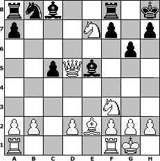 game notation in PGN-format [Event "Albspiele 4"] [Site "www.myChess.de"] [Date "2010.05.30"] [Round "1"] [White "Gauss1233"] [Black "reisender"] [ECO "A40"] [WhitemyELO "1475"] [BlackmyELO "1416"] [Result "1-0"] [TimeControl "10/2592000"] [WhiteDays "30"] [BlackDays "30"] [MyChessNo "65871"] 1. d4 g6 2. c4 Bg7 3. Nc3 e6 4. e4 Ne7 5. Nf3 d5 6. cxd5 exd5 7. e5 c6 8. Be2 O-O 9. Bg5 b6 10. O-O c5 11. dxc5 bxc5 12. Bxe7 Qxe7 13. Nxd5 Bxe5 14. Nxe7+ Kh8 15. Qd5 1-0 position notation in FEN-format rnb2r1k/p3Np1p/6p1/2pQb3/8/5N2/PP1PBPPP/R4RK1 - - - 2 15 Captured white pieces: Captured black pieces: Click on a captured piece in order to display the desired move!