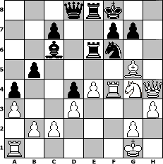 game notation in PGN-format [Event "Albspiele 11"] [Site "www.myChess.de"] [Date "2011.02.24"] [Round "1"] [White "Winston"] [Black "Knight"] [ECO "C44"] [WhitemyELO "1440"] [BlackmyELO "1164"] [Result "1-0"] [TimeControl "10/1728000"] [WhiteDays "20"] [BlackDays "20"] [MyChessNo "72274"] 1. e4 e5 2. Nf3 Nc6 3. a3 Nf6 4. Bc4 h6 5. Nc3 Bc5 6. d3 d6 7. h3 O-O 8. O-O Be6 9. Bb5 Bd7 10. Bxc6 Bxc6 11. Ne2 a5 12. Ng3 Re8 13. Nh2 b5 14. Nf5 d5 15. Ng4 d4 16. Ngxh6+ Kf8 17. Ng4 Re6 18. Bg5 Be7 19. Nxe7 Qxe7 20. Qf3 a4 21. Qg3 Re8 22. Qh4 Qd8 23. f4 exf4 24. Rxf4 1-0 position notation in FEN-format 3qrk2/2p2pp1/2b1rn2/1p4B1/p2pPRNQ/P2P3P/1PP3P1/R5K1 - - - 0 24 Captured white pieces: Captured black pieces: Click on a captured piece in order to display the desired move!