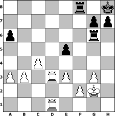 game notation in PGN-format [Event "2011 geht es rund!"] [Site "www.myChess.de"] [Date "2010.12.20"] [Round "1"] [White "sprinterde"] [Black "espero"] [ECO "A10"] [WhitemyELO "1614"] [BlackmyELO "1667"] [Result "1-0"] [TimeControl "10/864000"] [WhiteDays "47"] [BlackDays "48"] [MyChessNo "70650"] 1. c4 f5 2. Nc3 Nf6 3. e3 e5 4. Nf3 d6 5. Be2 Be7 6. O-O O-O 7. d4 Nc6 8. Qb3 Kh8 9. dxe5 dxe5 10. Rd1 Qe8 11. Nd5 Bd8 12. Nc3 b6 13. Ne1 Be6 14. Qa4 Ne4 15. Nxe4 fxe4 16. Rd2 Bh4 17. g3 Bg5 18. b3 a6 19. Nc2 Bh3 20. Bf1 Bxf1 21. Kxf1 Qe6 22. Ba3 Be7 23. Bxe7 Nxe7 24. Qd7 Qf6 25. Qxc7 Rac8 26. Qd6 Qg5 27. Qxb6 Rc6 28. Qb4 Rcf6 29. Qb7 Nc6 30. Kg2 Qh5 31. Ne1 Rh6 32. h4 Qg4 33. Kg1 Rhf6 34. Kg2 Rh6 35. Qd7 Rxh4 36. Qxg4 Rxg4 37. Rd6 Nb4 38. a3 Nd3 39. Nxd3 exd3 40. Rxd3 Rg6 41. Rad1 1-0 position notation in FEN-format 5r1k/6pp/p5r1/4p3/2P5/PP1RP1P1/5PK1/3R4 - - - 2 41 Captured white pieces: Captured black pieces: Click on a captured piece in order to display the desired move!