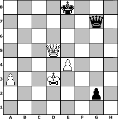 game notation in PGN-format [Event "K"] [Site "www.myChess.de"] [Date "2004.04.28"] [Round "1"] [White "Gambitianer"] [Black "doctordot2004"] [ECO "D08"] [WhitemyELO "1554"] [BlackmyELO "1487"] [Result "1/2-1/2"] [TimeControl "10/3456000"] [WhiteDays "227"] [BlackDays "239"] [MyChessNo "4195"] 1. d4 d5 2. c4 e5 3. dxe5 dxc4 4. Qa4+ Nc6 5. Nf3 a6 6. Qxc4 Be6 7. Qa4 b5 8. Qc2 Nb4 9. Qc3 Be7 10. a3 Na2 11. Qc6+ Bd7 12. Qc2 Nxc1 13. e3 c5 14. Nbd2 Nh6 15. Rxc1 Bf5 16. e4 Be6 17. Be2 c4 18. O-O Qb6 19. Qc3 Kf8 20. Nd4 Re8 21. Nxe6+ Qxe6 22. Kh1 Ng4 23. f4 h5 24. h3 Qb6 25. Bxc4 Rc8 26. Qb3 Nf2+ 27. Kh2 Ng4+ 28. hxg4 hxg4+ 29. Kg3 Qh6 30. Kf2 bxc4 31. Nxc4 Rd8 32. Ke2 Qh2 33. Ne3 Rh3 34. Qb6 g6 35. Rcd1 Rc8 36. Qxa6 Rxe3+ 37. Kxe3 Rc2 38. Kd4 Qxg2 39. f5 gxf5 40. Rxf5 Rc7 41. e6 Qxb2+ 42. Ke3 Rc3+ 43. Rd3 Bg5+ 44. Rxg5 Qc1+ 45. Kd4 Rxd3+ 46. Qxd3 Qxg5 47. exf7 g3 48. Qe3 Qg7+ 49. Kd3 g2 50. Qc5+ Kxf7 51. Qd5+ Ke8 52. Qa8+ Kf7 53. Qd5+ Ke8 1/2-1/2 position notation in FEN-format 4k3/6q1/8/3Q4/4P3/P2K4/6p1/8 - - - 6 54 Captured white pieces: ![]() ![]() ![]() ![]() ![]() ![]() ![]() ![]() ![]() ![]() ![]() ![]() ![]() ![]() ![]() Captured black pieces: ![]() ![]() ![]() ![]() ![]() ![]() ![]() ![]() ![]() ![]() ![]() ![]() ![]() ![]() ![]() Click on a captured piece in order to display the desired move!