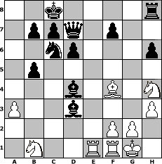 game notation in PGN-format [Event "unter uns Nr. 41 (Advendturnier 2017)"] [Site "www.myChess.de"] [Date "2017.11.29"] [Round "2"] [White "Geisterreiter"] [Black "wolni55"] [ECO "A00"] [WhitemyELO "1324"] [BlackmyELO "1398"] [Result "0-1"] [TimeControl "10/864000"] [WhiteDays "20"] [BlackDays "25"] [MyChessNo "110535"] 1. Nc3 e5 2. Nf3 Nc6 3. Nd5 Bc5 4. d4 exd4 5. Bf4 d6 6. a3 Be6 7. e4 h6 8. Bc4 a6 9. h3 Nf6 10. Qd3 Qd7 11. c3 dxc3 12. Nxf6+ gxf6 13. Qxc3 O-O-O 14. b4 Ba7 15. Bd5 Bxd5 16. b5 Bxe4 17. Nh4 axb5 18. Qxf6 Rde8 19. O-O Bd4 20. Qxh8 Rxh8 21. Rae1 Bd3 0-1 position notation in FEN-format 2k4r/1ppq1p2/2np3p/1p6/3b1B1N/P2b3P/5PP1/1N2RRK1 - - - 2 22 Captured white pieces: Captured black pieces: Click on a captured piece in order to display the desired move!
