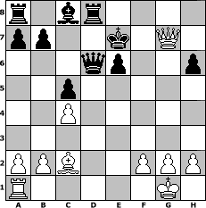game notation in PGN-format [Event "M"] [Site "www.myChess.de"] [Date "2013.09.19"] [Round "1"] [White "alibengali"] [Black "Joschi"] [ECO "B17"] [WhitemyELO "1617"] [BlackmyELO "1598"] [Result "1-0"] [TimeControl "10/3456000"] [WhiteDays "40"] [BlackDays "40"] [MyChessNo "90317"] 1. e4 c6 2. d4 d5 3. Nc3 dxe4 4. Nxe4 Nd7 5. Bc4 Ngf6 6. Ng5 e6 7. Qe2 Nb6 8. Bb3 h6 9. N5f3 Be7 10. Ne5 Qxd4 11. Ngf3 Qd8 12. O-O O-O 13. Rd1 Qc7 14. c4 Nbd7 15. Bf4 Nxe5 16. Nxe5 Qb6 17. Rd3 Rd8 18. Rg3 Kf8 19. Ng4 Nh5 20. Rf3 Nxf4 21. Rxf4 Bd6 22. Ne5 Bxe5 23. Qxe5 c5 24. Bc2 Qd6 25. Qe4 g6 26. Rxf7+ Kxf7 27. Qxg6+ Ke7 28. Qg7+ 1-0 position notation in FEN-format r1br4/pp2k1Q1/3qp2p/2p5/2P5/8/PPB2PPP/R5K1 - - - 2 28 Captured white pieces: Captured black pieces: Click on a captured piece in order to display the desired move!
