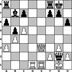 game notation in PGN-format [Event "Februar 2017"] [Site "www.myChess.de"] [Date "2017.02.05"] [Round "1"] [White "alpacino"] [Black "faustballer"] [ECO "C00"] [WhitemyELO "1306"] [BlackmyELO "1502"] [Result "0-1"] [TimeControl "10/1728000"] [WhiteDays "53"] [BlackDays "60"] [MyChessNo "106797"] 1. e4 e6 2. Nf3 a6 3. c3 Bc5 4. d4 Be7 5. Nbd2 Nf6 6. Bd3 b5 7. e5 Nd5 8. O-O Bb7 9. Ne4 h6 10. a3 Nc6 11. Re1 d6 12. Bd2 dxe5 13. dxe5 Nb6 14. Qe2 Na5 15. b4 Nc6 16. Be3 Nd7 17. Qd2 Ncxe5 18. Nxe5 Nxe5 19. Bd4 Nxd3 20. Qxd3 e5 21. Qe3 exd4 22. cxd4 O-O 23. Nc5 Bxc5 24. dxc5 Qg5 25. g3 Qd5 26. Rad1 Qg2# 0-1 position notation in FEN-format r4rk1/1bp2pp1/p6p/1pP5/1P6/P3Q1P1/5PqP/3RR1K1 - - - 3 27 Captured white pieces: Captured black pieces: Click on a captured piece in order to display the desired move!