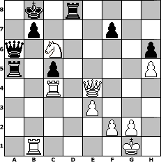 game notation in PGN-format [Event "F"] [Site "www.myChess.de"] [Date "2017.08.16"] [Round "1"] [White "espero"] [Black "martinus"] [ECO "A45"] [WhitemyELO "1964"] [BlackmyELO "1754"] [Result "1-0"] [TimeControl "10/2592000"] [WhiteDays "076"] [BlackDays "119"] [MyChessNo "109204"] 1. d4 Nf6 2. Bg5 e6 3. Nd2 h6 4. Bh4 g5 5. Bg3 Nc6 6. e3 d5 7. h4 g4 8. h5 Bd6 9. Bh4 Rg8 10. Bb5 Bd7 11. Ne2 Be7 12. c3 a6 13. Bd3 e5 14. Bc2 e4 15. Bxf6 Bxf6 16. c4 dxc4 17. Nxe4 Nb4 18. b3 cxb3 19. Bxb3 Qe7 20. Nxf6+ Qxf6 21. Qd2 Nc6 22. O-O O-O-O 23. Rfc1 Qe7 24. Ng3 Kb8 25. Rab1 Rg5 26. Bc4 a5 27. d5 Nb4 28. a3 Bb5 29. axb4 Bxc4 30. Rxc4 Rgxd5 31. Qe2 Rd2 32. Qxg4 R2d5 33. bxa5 Rxa5 34. Nf5 Qf6 35. Nd4 c5 36. Qe4 Qa6 37. Nc6+ 1-0 position notation in FEN-format 1k1r4/1p3p2/q1N4p/r1p4P/2R1Q3/4P3/5PP1/1R4K1 - - - 3 37 Captured white pieces: Captured black pieces: Click on a captured piece in order to display the desired move!