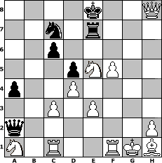 game notation in PGN-format [Event "960 Chess Fun"] [Site "www.myChess.de"] [Date "2006.03.14"] [Round "1"] [White "Seneca"] [Black "MichaelKnopf"] [Variant "Fischerrandom"] [SetUp "1"] [FEN "nrnqkrbb/pppppppp/8/8/8/8/PPPPPPPP/NRNQKRBB w KQkq - 0 1"] [WhitemyELO "1825"] [BlackmyELO "1495"] [Result "1-0"] [TimeControl "10/864000"] [WhiteDays "10"] [BlackDays "10"] [MyChessNo "23597"] 1. Nab3 f5 2. d4 g6 3. c3 b6 4. Nd3 d6 5. g3 d5 6. Nb4 Qd6 7. e3 a5 8. Nd3 c6 9. f4 Na7 10. Bf2 Nc7 11. Ne5 a4 12. Nd2 b5 13. g4 fxg4 14. Qxg4 Be6 15. Qh4 Bg8 16. Ndf3 Bf6 17. Qh3 h5 18. Nxg6 Rf7 19. Bh4 Bh7 20. f5 b4 21. Rc1 bxc3 22. bxc3 Qa3 23. O-O Qxa2 24. Bxf6 exf6 25. Qxh5 Nab5 26. Nh8 Bg8 27. Nxf7 Kd7 28. Qg6 Re8 29. Nh6 Nd6 30. Nxg8 Ne4 31. Nxf6+ Nxf6 32. Qxf6 Re7 33. Ne5+ Ke8 34. Qh8# 1-0 position notation in FEN-format 4k2Q/2n1r3/2p5/3pNP2/p2P4/2P1P3/q6P/N1R2RKB - - - 4 34 Captured white pieces: Captured black pieces: Click on a captured piece in order to display the desired move!