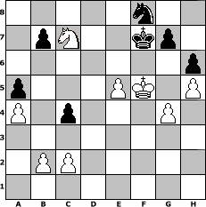 game notation in PGN-format [Event "Schwedisches Schlagen (Kubb)"] [Site "www.myChess.de"] [Date "2006.03.20"] [Round "1"] [White "Zoidberg"] [Black "bjeu"] [ECO "A40"] [WhitemyELO "1882"] [BlackmyELO "2079"] [Result "1-0"] [TimeControl "10/864000"] [WhiteDays "52"] [BlackDays "17"] [MyChessNo "23791"] 1. d4 e5 2. dxe5 Nc6 3. Nf3 d6 4. exd6 Bxd6 5. g3 Nf6 6. Bg2 O-O 7. O-O Qe7 8. Nc3 Rd8 9. Bd2 Bb4 10. Qe1 Bf5 11. Rc1 a5 12. a3 Bc5 13. e3 Bg4 14. Ne2 Bb6 15. Ned4 Nb8 16. Bc3 c5 17. Ne2 Nc6 18. h3 Be6 19. Bxf6 Qxf6 20. Qc3 Qxc3 21. Nxc3 h6 22. Rcd1 Ba7 23. Nd2 Rd7 24. Nb3 c4 25. Rxd7 Bxd7 26. Nd2 Be6 27. Rd1 Rd8 28. g4 Kf8 29. Kf1 f6 30. Ke1 Bb8 31. Nde4 Rxd1+ 32. Kxd1 Nd8 33. f4 Ba7 34. Ke2 Ke7 35. Nd2 Bf7 36. Bd5 Bxd5 37. Nxd5+ Kd6 38. Nc3 Kc5 39. a4 Bb8 40. Kf3 Ne6 41. Nde4+ Kc6 42. Nb5 Kd5 43. Nec3+ Kc5 44. Ke4 Nf8 45. h4 Nd7 46. Kf5 Nf8 47. h5 Kc6 48. e4 Bd6 49. Nxd6 Kxd6 50. e5+ fxe5 51. fxe5+ Ke7 52. Nd5+ Kf7 53. Nc7 1-0 position notation in FEN-format 5n2/1pN2kp1/7p/p3PK1P/P1p3P1/8/1PP5/8 - - - 4 53 Captured white pieces: Captured black pieces: Click on a captured piece in order to display the desired move!