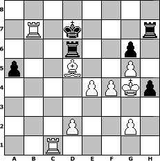 game notation in PGN-format [Event "Novemberturnier"] [Site "www.myChess.de"] [Date "2004.11.04"] [Round "1"] [White "Falcor"] [Black "Andylein1989"] [ECO "D21"] [WhitemyELO "1215"] [BlackmyELO "1505"] [Result "1-0"] [TimeControl "10/2592000"] [WhiteDays "144"] [BlackDays "149"] [MyChessNo "7809"] 1. d4 d5 2. c4 dxc4 3. Nf3 Nc6 4. e3 Bf5 5. Nc3 Bg4 6. Bxc4 e6 7. h3 Bxf3 8. Qxf3 Nf6 9. O-O e5 10. d5 Nb4 11. Rd1 Nc2 12. Rb1 Bb4 13. Ne4 Be7 14. a3 Qd7 15. b4 O-O-O 16. Nxf6 Bxf6 17. Qe2 Qa4 18. Qd3 Rd6 19. Bb3 e4 20. Qxc2 Qb5 21. Qxe4 Qe2 22. Rf1 Bh4 23. Qxh4 Rf6 24. Bb2 Rh6 25. Qf4 f6 26. Bxf6 Rxf6 27. Qg4+ Qxg4 28. hxg4 h5 29. g5 Rg6 30. f4 h4 31. Kh2 Rh5 32. Kh3 Ra6 33. a4 Rd6 34. e4 g6 35. Bc4 a6 36. b5 axb5 37. Bxb5 c6 38. Bc4 cxd5 39. Bxd5 b6 40. Kg4 Rh7 41. Rfc1+ Kd7 42. a5 bxa5 43. Rb7+ 1-0 position notation in FEN-format 8/1R1k3r/3r2p1/p2B2P1/4PPKp/8/3P2P1/2R5 - - - 1 43 Captured white pieces: Captured black pieces: Click on a captured piece in order to display the desired move!