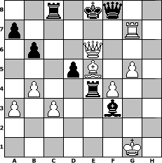 game notation in PGN-format [Event "Schach dem "Nikolaus II""] [Site "www.myChess.de"] [Date "2010.11.13"] [Round "1"] [White "Rotstift10"] [Black "Ziegert"] [ECO "A40"] [WhitemyELO "1568"] [BlackmyELO "1521"] [Result "1-0"] [TimeControl "10/2592000"] [WhiteDays "107"] [BlackDays "078"] [MyChessNo "69821"] 1. d4 e6 2. e4 d5 3. Nd2 c5 4. dxc5 Bxc5 5. e5 Nd7 6. Ngf3 Qb6 7. Qe2 Ne7 8. a3 Ng6 9. b4 Bd4 10. Nxd4 Qxd4 11. Nb3 Qc3+ 12. Qd2 Qxe5+ 13. Be2 O-O 14. O-O Nf6 15. f4 Qc7 16. Bd3 b6 17. Bb2 Nh5 18. Bxg6 fxg6 19. Be5 Qe7 20. g4 Nf6 21. h3 Ne4 22. Qe1 Ba6 23. Rf3 Rac8 24. Nd4 Nd6 25. g5 Nf5 26. c3 Rc4 27. Ra2 Rfc8 28. h4 Nd6 29. Rh2 Ne4 30. Ne2 R4c6 31. Ng3 Rc4 32. h5 gxh5 33. Rxh5 Qf8 34. Nxe4 Rxe4 35. Qg3 Be2 36. Qh3 Bxf3 37. Rxh7 Kf7 38. Rxg7+ Ke8 39. Qxe6+ 1-0 position notation in FEN-format 2r1kq2/p5R1/1p2Q3/3pB1P1/1P2rP2/P1P2b2/8/6K1 - - - 0 39 Captured white pieces: Captured black pieces: Click on a captured piece in order to display the desired move!