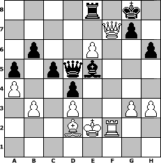 game notation in PGN-format [Event "Spass am Schach Runde 2"] [Site "www.myChess.de"] [Date "2011.07.01"] [Round "1"] [White "wiesel"] [Black "Haki"] [ECO "A45"] [WhitemyELO "1265"] [BlackmyELO "1331"] [Result "1-0"] [TimeControl "10/1728000"] [WhiteDays "18"] [BlackDays "20"] [MyChessNo "74875"] 1. d4 Nf6 2. Nc3 d5 3. Nf3 Nc6 4. e3 e6 5. Bd3 Bd6 6. O-O O-O 7. Re1 e5 8. dxe5 Nxe5 9. Nxe5 Bxe5 10. Ne2 Qd6 11. g3 c5 12. Rb1 Bg4 13. b3 d4 14. e4 a5 15. a4 Qc6 16. Ba3 b6 17. Qd2 Qe6 18. Bc1 Bh3 19. f4 Bd6 20. f5 Qc8 21. Nf4 Qc7 22. Ne2 Nh5 23. Qg5 Nf6 24. Nf4 h6 25. Qh4 Bg4 26. Bd2 Rfe8 27. h3 Bf3 28. Kf2 Bxe4 29. Re2 Bxd3 30. cxd3 Rxe2+ 31. Nxe2 Nd5 32. Nf4 Re8 33. Nxd5 Qc6 34. Nf4 Qc8 35. Qg4 Qb8 36. Rf1 Be5 37. Ke2 Qd8 38. Ne6 fxe6 39. fxe6 Qd5 40. Qf5 Qg2+ 41. Rf2 Qd5 42. Qf7+ 1-0 position notation in FEN-format 4r1k1/5Qp1/1p2P2p/p1pqb3/P2p4/1P1P2PP/3BKR2/8 - - - 6 42 Captured white pieces: Captured black pieces: Click on a captured piece in order to display the desired move!