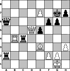 game notation in PGN-format [Event "COS Clubmeisterschaft 2012"] [Site "www.myChess.de"] [Date "2012.05.04"] [Round "1"] [White "martinus"] [Black "ujack1961"] [ECO "A57"] [WhitemyELO "1705"] [BlackmyELO "1752"] [Result "1-0"] [TimeControl "10/2592000"] [WhiteDays "113"] [BlackDays "054"] [MyChessNo "81571"] 1. d4 Nf6 2. c4 c5 3. d5 b5 4. cxb5 a6 5. e3 g6 6. Nc3 Bg7 7. Nf3 O-O 8. Qb3 d6 9. Be2 axb5 10. Bxb5 Ba6 11. O-O Nbd7 12. Bxa6 Rxa6 13. e4 Qc7 14. Qc2 Rb8 15. Bf4 Ne8 16. Rfe1 Qa7 17. a3 Rab6 18. Ra2 Nc7 19. Nd2 Nb5 20. Be3 Nxc3 21. bxc3 Ra6 22. a4 Nb6 23. Rb1 Ra8 24. Rab2 Bxc3 25. Rb5 Bb4 26. R1xb4 cxb4 27. Rxb4 Qd7 28. Bxb6 Rxa4 29. Rb1 Ra2 30. Qd3 Qc8 31. h3 Rc2 32. Bd4 Raa2 33. Nc4 f6 34. Rb4 Qa6 35. e5 dxe5 36. Be3 Kf7 37. d6 Rxc4 38. Qd5+ Kg7 39. dxe7 1-0 position notation in FEN-format 8/4P1kp/q4pp1/3Qp3/1Rr5/4B2P/r4PP1/6K1 - - - 0 39 Captured white pieces: Captured black pieces: Click on a captured piece in order to display the desired move!