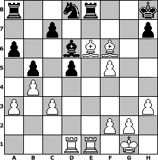 game notation in PGN-format [Event "2016"] [Site "www.myChess.de"] [Date "2016.01.01"] [Round "1"] [White "hape50"] [Black "S04boy"] [ECO "D00"] [WhitemyELO "1281"] [BlackmyELO "1235"] [Result "1-0"] [TimeControl "10/2592000"] [WhiteDays "30"] [BlackDays "28"] [MyChessNo "101936"] 1. d4 d5 2. e3 Nf6 3. h3 Nc6 4. Nf3 Bf5 5. Be2 e6 6. a3 Bd6 7. Nc3 Ne4 8. Bd2 O-O 9. Nxe4 Bxe4 10. O-O Qf6 11. b4 a6 12. c3 Bxf3 13. Bxf3 b5 14. Re1 e5 15. dxe5 Qxe5 16. Bg4 f5 17. Bf3 g5 18. Bh5 f4 19. exf4 Qf5 20. Bg4 Qd3 21. Be6+ Kh8 22. f5 Nd8 23. Bxg5 Qxd1 24. Raxd1 Re8 25. Bf6# 1-0 position notation in FEN-format r2nr2k/2p4p/p2bBB2/1p1p1P2/1P6/P1P4P/5PP1/3RR1K1 - - - 2 25 Captured white pieces: Captured black pieces: Click on a captured piece in order to display the desired move!